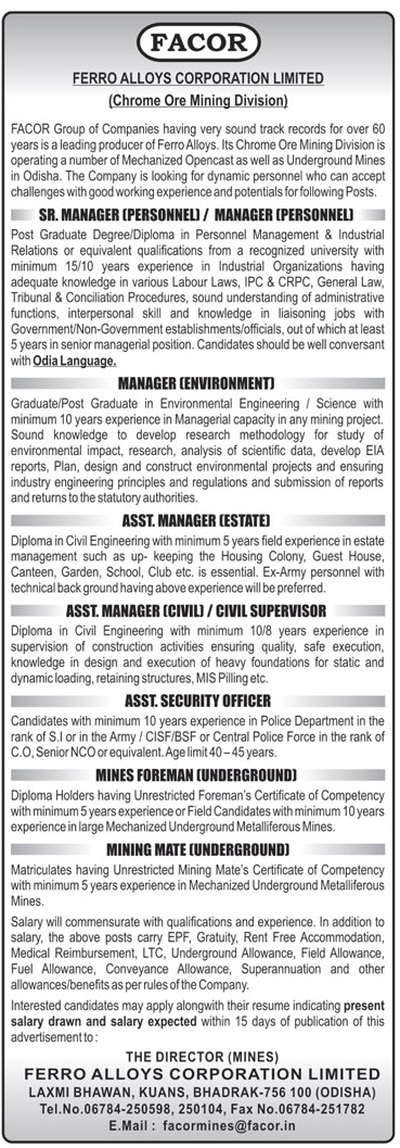 Qualification: Diploma Holders having unrestricted Foreman’s Foreman’s certificate of competency with minimum 5 years experience of Field Candidates with minimum 10 years experience in large Mechanized underground Metalliferous Mines.
