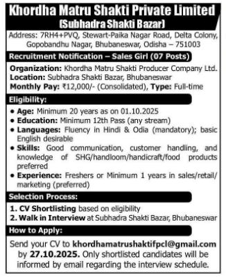Walk-in at Khordha-Matru-Shakti-Pvt-Ltd Oct-25