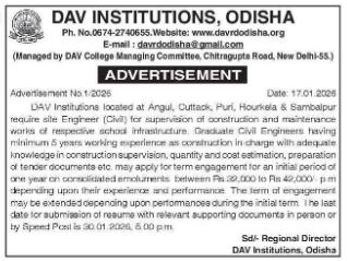 Vacancy at DAV-Institutions-Odisha Jan-26